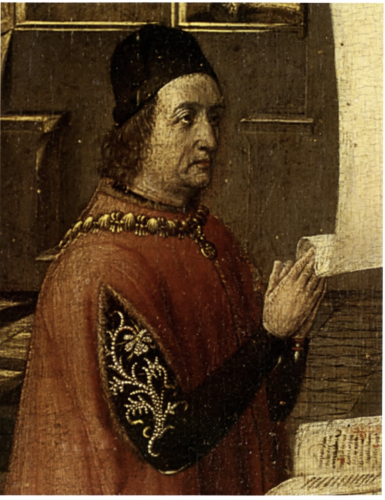 portrait peint de Phiilippe Pot (détail), en prière devant la Vierge, autrefois à Notre-Dame de Dijon et identifié par Jean-Bernard de Vaivre à l'occasion de sa vente en 2004