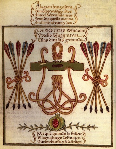 Le fait que la grenade soit ouverte semble vouloir signifier que le fruit est mûr et prêt à tomber, claire évocation des problèmes internes du royaume de Grenade qui vont permettre sa conquête par les souverains catholiques en 1492.