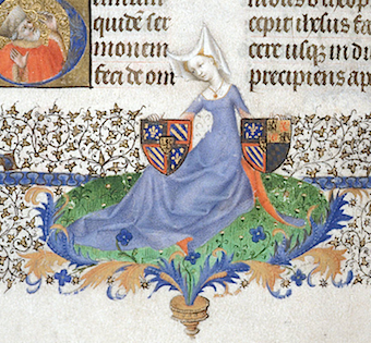 Une représentation de Marguerite de Bavière ? tenant les armes de Jean sans Peur et les siennes sur une terrasse de violettes. Bréviaire de Jean sans Peur (Londres, B. L., Ms. Harley 2897, fol. 188v°)